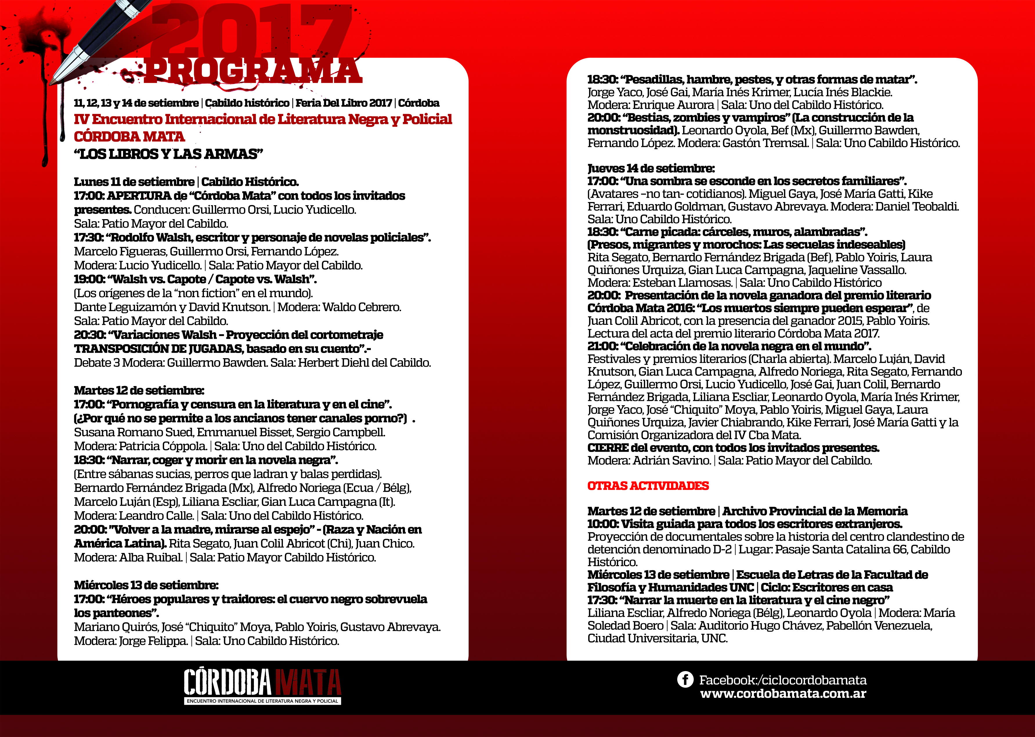Además, en el marco del CÓRDOBA MATA el día jueves 14 de septiembre a las 20 se revelará el nombre del ganador del Premio Internacional de Novela Negra que ya reconoció a los autores Pablo Yoiris (2015) y Juan Colil Abricot (2016).