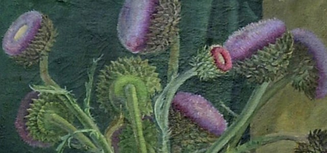 La obra pictórica Cardos que integra la colección del Museo Caraffa, es una llamativa escena de flores silvestres, florero, mesa de luz, fotografía o postal inclinada sobre el fondo de pliegues verdes y blancos de una cortina o manto. La imagen condensa esa tensión entre naturaleza y artificio que la mirada de la artista conjuga iluminando el mundo.